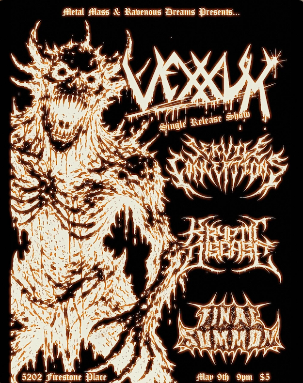 Vexxum / Servile Conceptions / Kryptic Disease / Final Summon Saturday, May 9, 2026 9:00 PM 11:00 PM 21:00 23:00 5202 Firestone Place Downey, CA, 90241 United States (map) Google Calendar ICS $5 - 18+